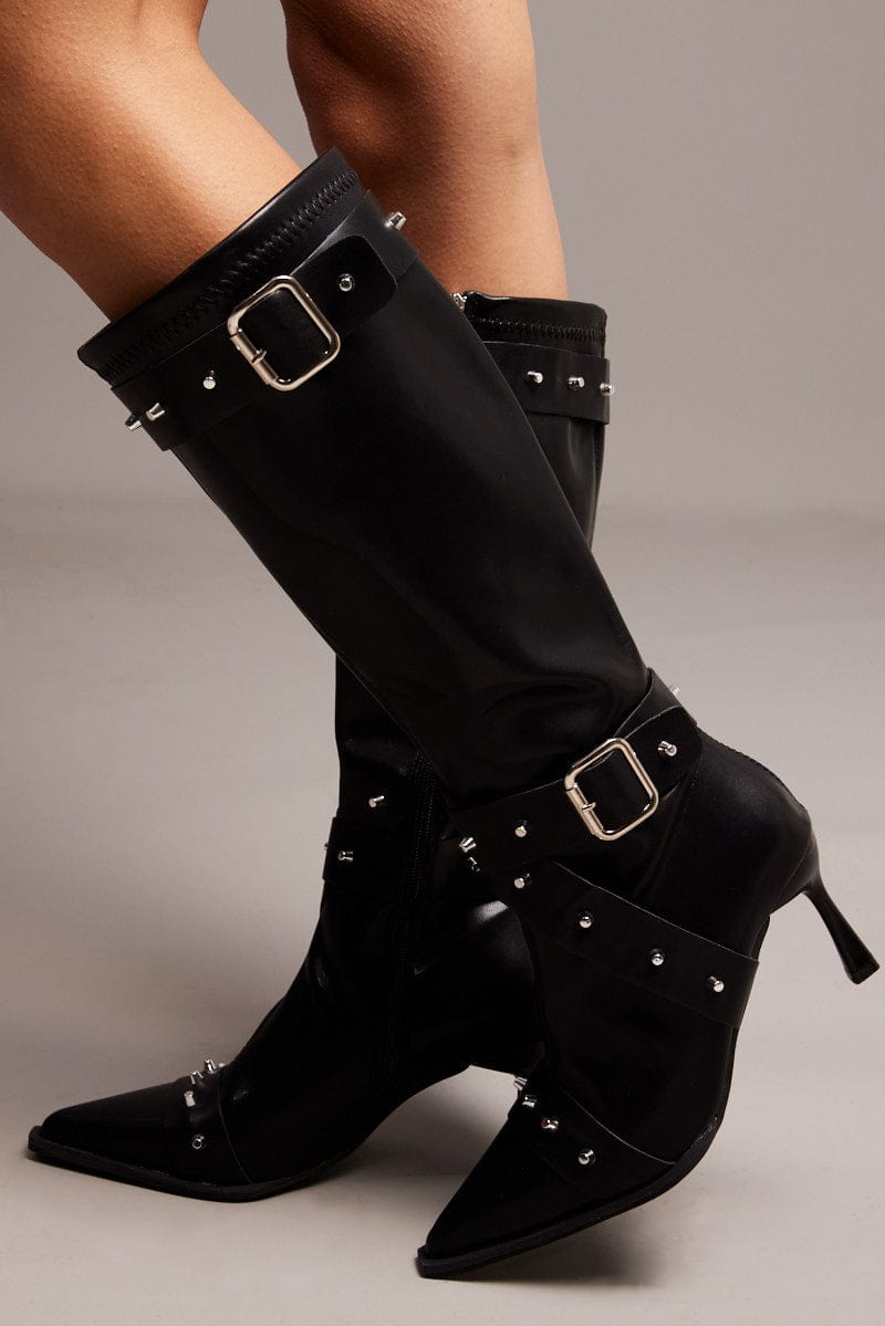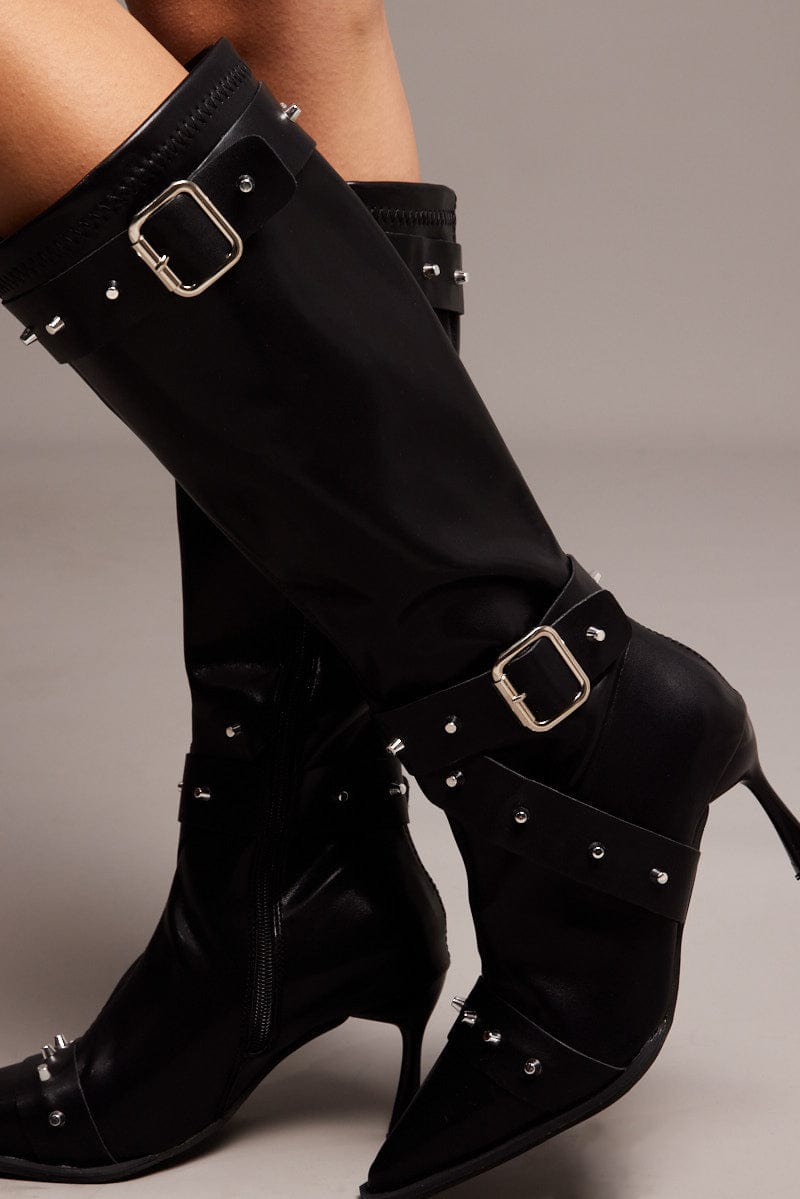 Black Studded Strap Heeled Knee Boots