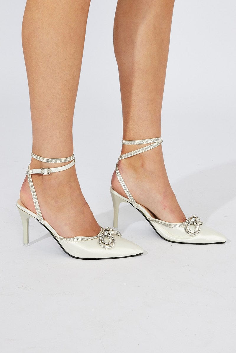White Diamonte Bow Strappy Pointed Heels
