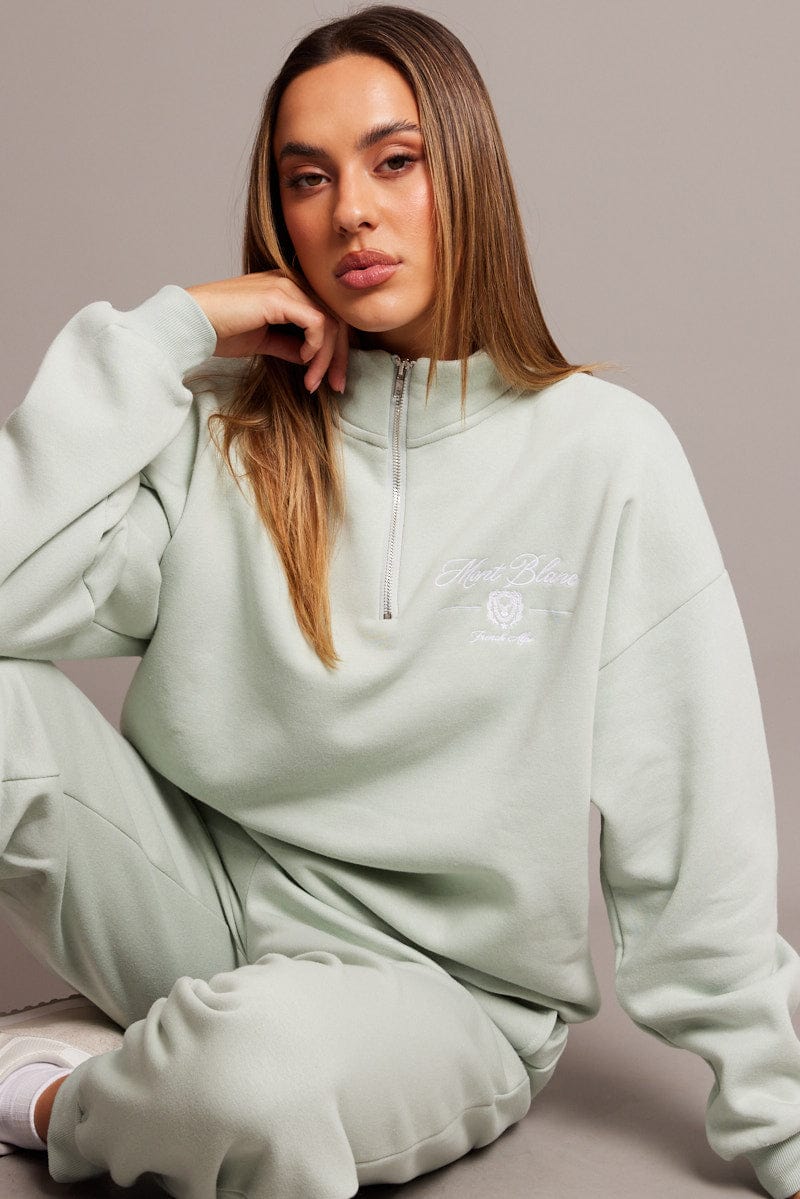 Green Zip Sweater Funnel Neck Oversized