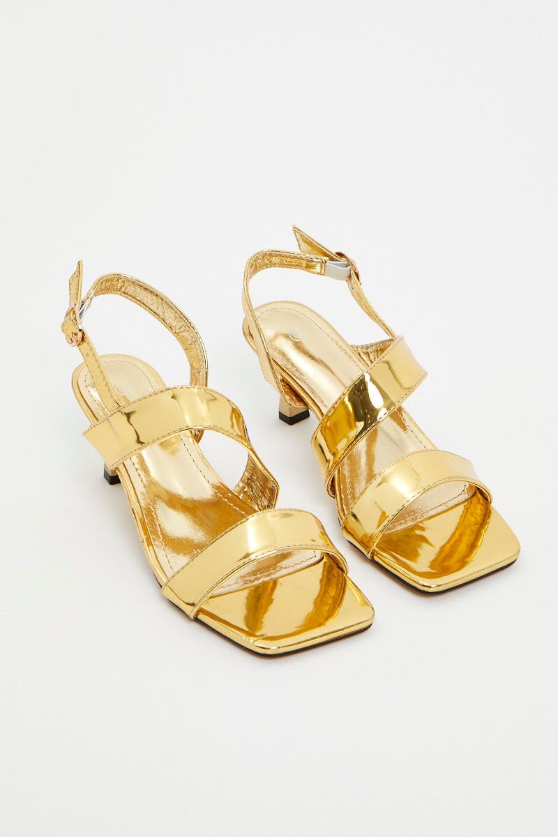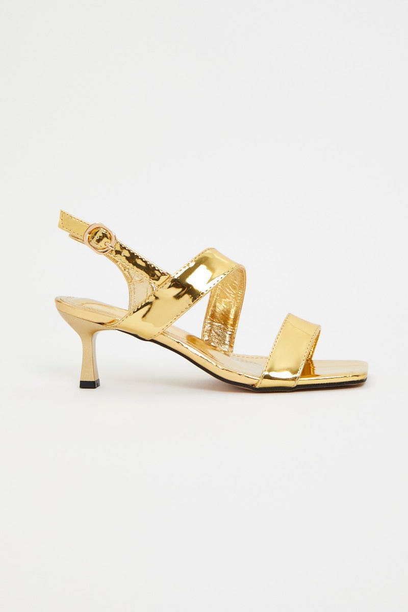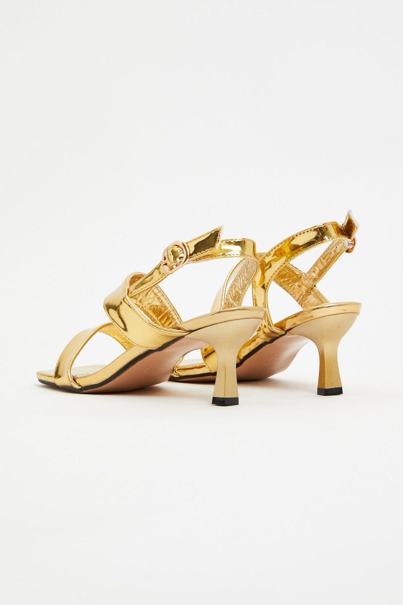 Features: Heels. Strappy Design. Gold Gold. Ankle Buckle